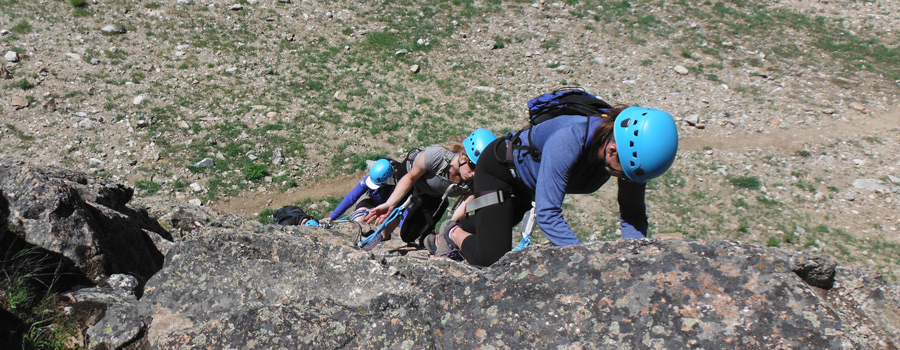 Our guide, Shannon Schiner, doubles as a Ski Instructor in the winter. Shannon is one of the most knowledgeable and positive people I know. She is an incredible teacher and coach. She loves Jackson Hole and you will also feel this energy and pride as you climb with her. She met us at the base to go over the plan for the day. After a short introduction, we ascended the gondola to the Rendezvous Lodge where we obtained our approach shoes (a sneaker like shoe with sticky rubber soles better for climbing) and strapped on our harnesses and helmets (bring a visor for extra shade under your helmet). We grabbed some water and headed down a short trail to the practice route for an in-depth safety talk and explanation of what to expect.