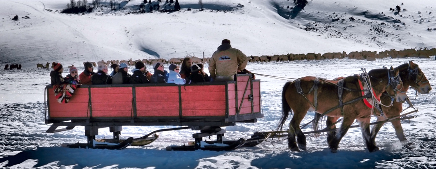 We live, work, and play in this Winter Wonderland. Taking a break from the slopes, we ventured north of town to the National Elk Refuge. Bonnie and Clyde, 2 two-ton horses, steered us through the refuge. We were arm’s length from these animals, able to observe and photograph them bedding and feeding. We had never seen elk so close! We felt lucky as the sleigh ride is the only way to access the refuge – you don’t want to miss out on this experience.